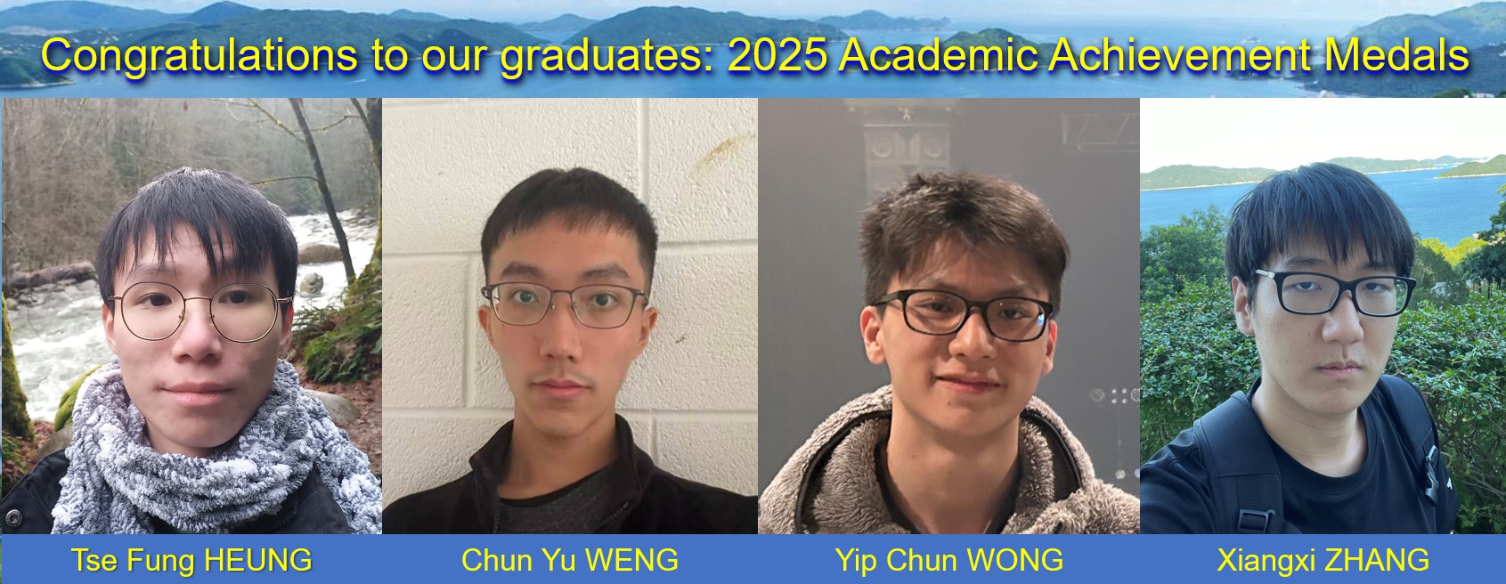 Congratulations to Tse Fung Heung, Chun Yu Weng, Yip Chun Wong, and Xiangxi Zhang (l-r) for being awarded 2025 Academic Achievement Medals. The Academic Achievement Medal is the highest academic honor bestowed by the University on outstanding undergraduate students upon graduation. The awarding of the Medal was established in 1994 to recognize graduates whose outstanding academic achievements bring honor and distinction both to themselves and to the University. Only the top 1% of graduates are awarded the Academic Achievement Medal annually. These awards will be presented at the 33rd University Congregation on 29 November 2025. The Department is very proud of all graduates and additionally delighted in the achievements of the Academic Achievement Medal awardees.